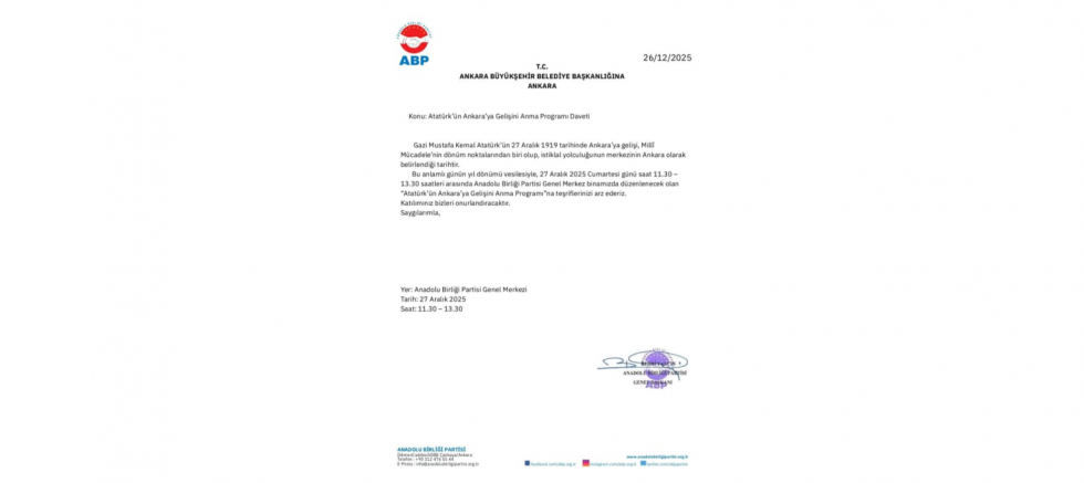 Anadolu Birliği Partisi tarafından 27 Aralık 2025 Cumartesi günü Ankara’da gerçekleştirilecek programın, birlik ve beraberlik duygusu içinde yapılacağı bildirildi. Genel Merkez Salonu’nda düzenlenecek etkinlikte saygı duruşu ve İstiklal Marşı’nın okunmasının ardından mehteran gösterisi gerçekleştirilecek.