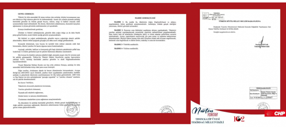 ​Cumhuriyet Halk Partisi (CHP) Tekirdağ Milletvekili Nurten Yontar, raflardaki ürünlerin ambalajı ile içeriği arasındaki görsel farkların tüketiciyi yanılttığını belirterek, bu güven sorununu gidermek amacıyla Türkiye Büyük Millet Meclisi (TBMM) Başkanlığına bir kanun teklifi sundu.